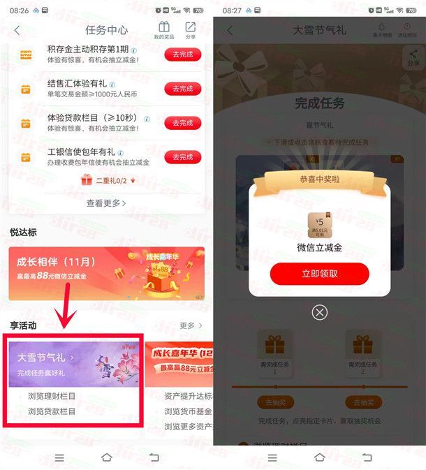 小编提示:打开中国工商银行APP搜索【任务中心】进去,在享活动那里点【大雪节气礼】进去,完成2个简单的浏览任务可以抽奖2次,刚中5元