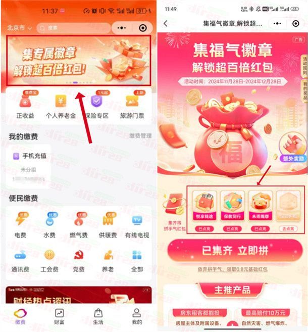 小编提示:复制下面文字到微信点开,点顶部滚动图“集专属徽章 解锁超百倍红包!”进去,完成“集徽章 拼手气”任务即可(新购指定3款互联网保险产品中的任一款产品),完成任务1个工作日后可点亮5个徽章,领取58元缴费红包(针对云缴费的保险新客户),可以交水电费抵扣。