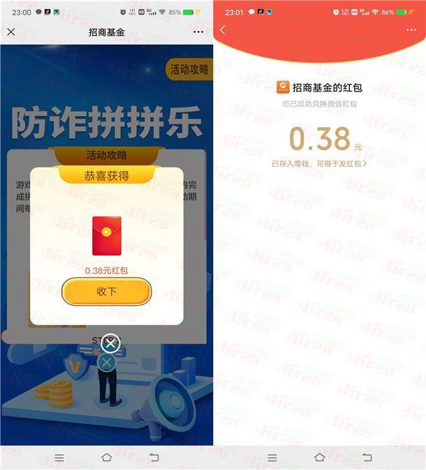 招商基金防诈拼拼乐小游戏抽1万个微信红包 亲测中0.38元