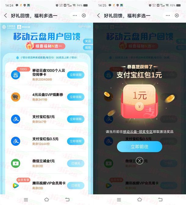 移动云盘领0.5-1元支付宝红包、1元微信立减金 亲测秒到账