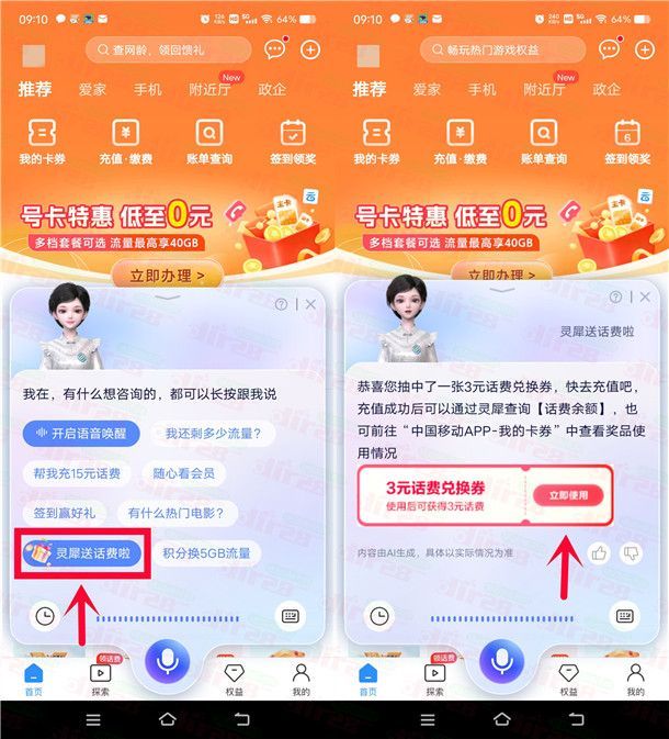 参加中国移动举办的AI灵犀抽话费活动,通过打开中国移动APP,点底部“灵AI犀”再点【灵犀送话费啦】抽奖,有机会中到随机金额的手机话费、或者手机流量,小编测试中到3元手机话费,需要手动领取秒到,非必中,这个活动并非每个人都有入口。