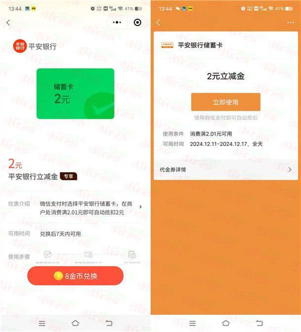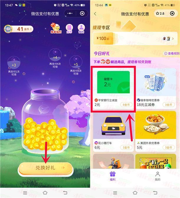 这个活动只有部分微信才有入口参加,通过打开微信进去【微信支付有优惠】小程序里,点底部【兑换好礼】进去,如果进去有显示2元平安银行立减金就可以用8个金币兑换,只有部分用户才有,如果没有金币的可以大小号相互赠送金币,注册过平安口袋银行二类电子卡的也可以去。