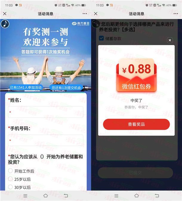 南方基金养老调查问卷抽2万个微信红包 亲测中0.88元秒推