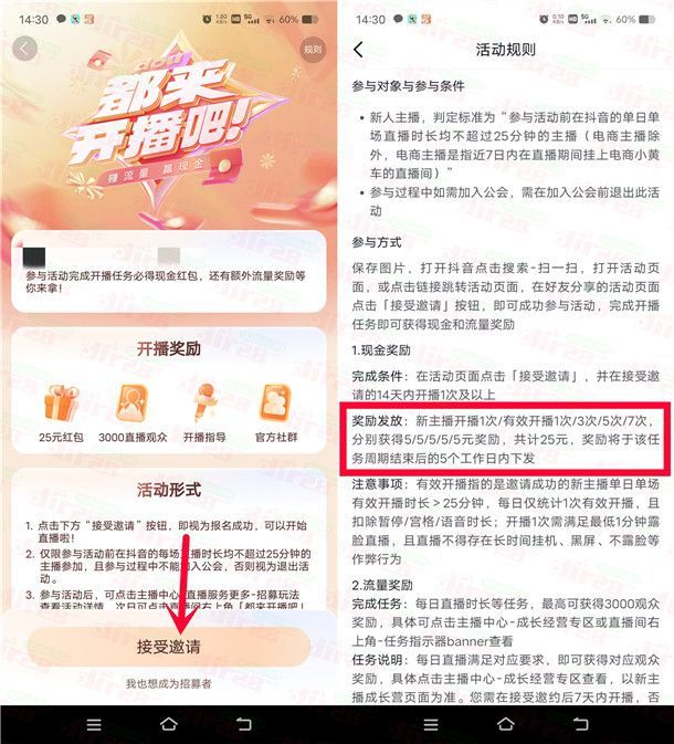 参加抖音举办的开直播领25元现金红包活动,通过打开抖音APP进去活动里,进去接收邀请报名参加,首次开播1次、3次、5次、7次可以分别领取到5元+5元+5元+5元+5元现金红包,合计可以领到25元现金红包,每次需要开播25分钟,得到的现金红包可以在抖音APP里提现。