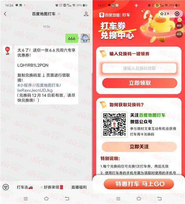 小编提示:微信搜索公众号【百度地图打车】回复【666】参加,可获得一张6.6元百度地图打车券,按照提示进去兑换就行,满10元减6.6元