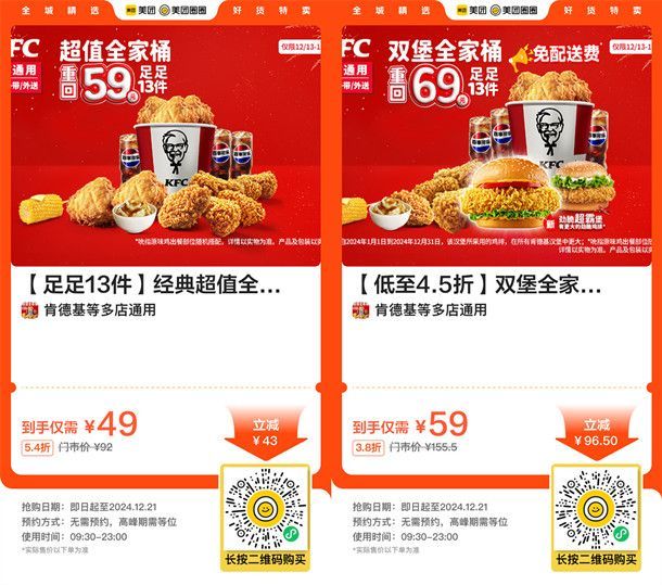 喜欢吃肯德基的可以去,这是美团肯德基的一个团购活动,通过打开微信进去美团活动里,可以49元购买肯德基超值全家桶13件套、也可以59元购买肯德基双汉堡全家桶13件套,到店或者外卖都可以使用,12月13日-12月21日之间可用,免配送费。
