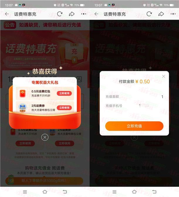 淘宝简单领取0.5元话费红包 可0.5充1元电信、联通手机话费