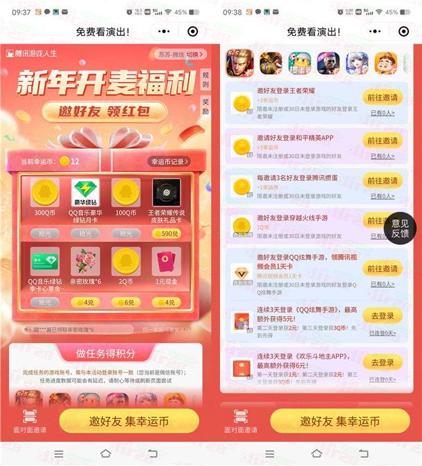 参加腾讯游戏人生举办的信念开麦福利活动,这个活动微信和QQ都可以参加,通过打开微信和手机QQ进去活动里,下拉页面到底完成登录游戏的任务可以领现金红包、Q币,邀请好友助力也可以兑换现金红包和Q币,数量限量。