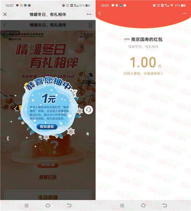 南京国寿情暖冬日有礼相伴活动抽1元微信红包 亲测中1元