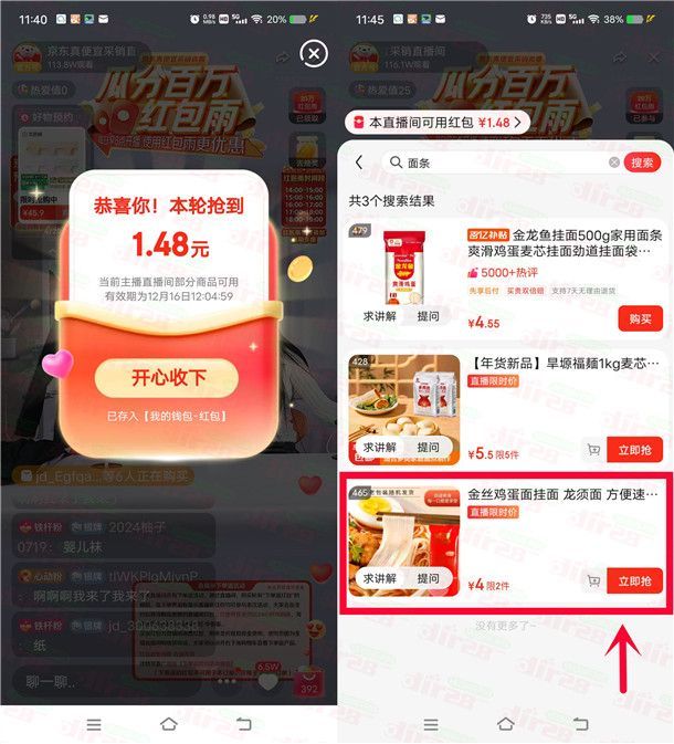 小编提示:打开京东APP扫码进去直播间里,点击右侧【红包雨】可以领无门槛红包,然后再点击右下角购物袋图标搜索【面条】可以0.01元买1包龙须挂面(点击4元的金丝鸡蛋面进去,规格选择1包的就是0.01元),搜索【国风】也可以几毛钱买1包抽纸
