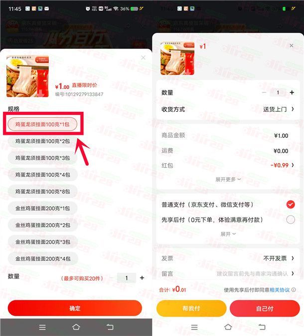 京东直播间0.01元撸一包挂面、或抽纸包邮 简单百万红包雨活动