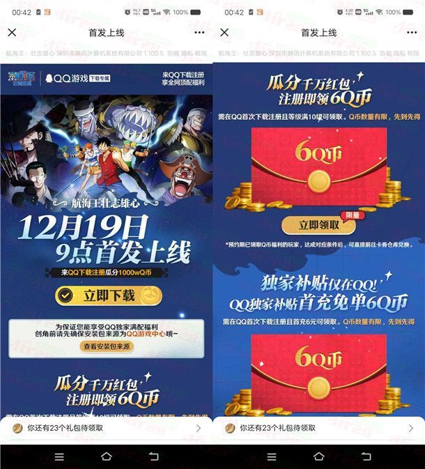 航海王:壮志雄心是今天新上线的一个腾讯游戏活动,今天预计会有多个活动可以参加,通过打开微信和手机QQ进去活动里,下载航海王app手游,首次用微信或者QQ注册登录游戏可以领取到6-888元微信红包、6-888个Q币,完成其他等级和要求还可以领取红包和Q币,每一个档位的红包和Q币数量限量。
