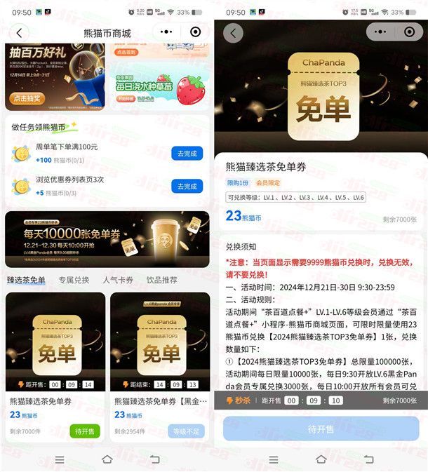 茶百道小程序每天10点23个熊猫币兑换1万张免单券 每天限量