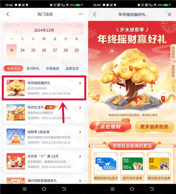 小编提示:打开浦发银行APP,首页点【热门活动】进去,点【年终摇财赢好礼】进去,完成2个浏览任务可以抽2次,非必中,只有中到前几个才有用,后面几个券是没用的
