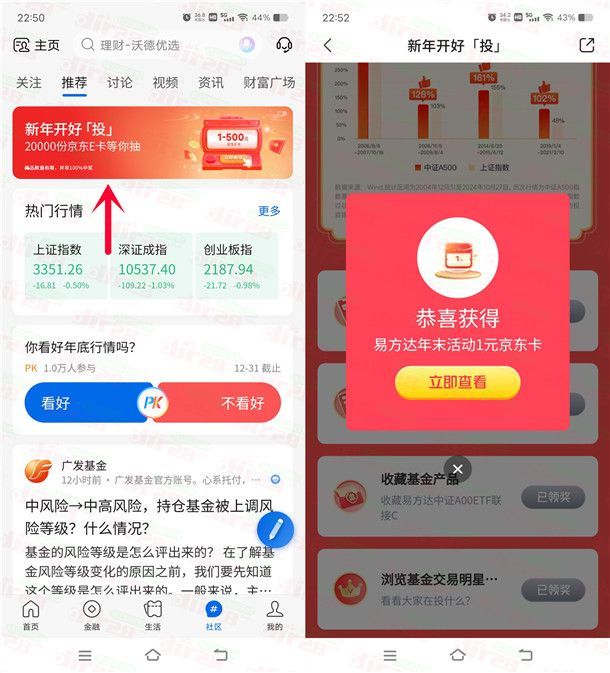 参加交通银行举办的新年开好投好礼来相送抽2万份京东卡活动,通过打开交通银行APP,点底部“社区”再点顶部滚动图“新年开好投”进去,下拉到底完成4个简单的任务可以抽奖4次,有机会中到1-500元京东卡,小编测试刚中1元秒到,非必中。