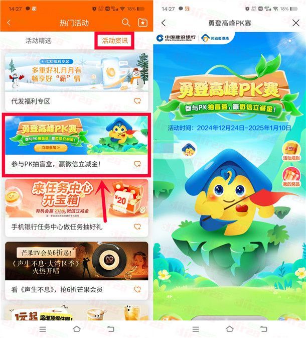 参加建行劳动者港湾举办的勇登高峰PK赛抽15万份微信立减金活动,通过打开“建行生活”APP,首页下拉页面点【热门活动】进去,再点【活动资讯】下拉页面找到【勇登高峰PK赛】进去,每天完成3次小游戏通关可以抽奖3次,完成6个简单的浏览任务还可以额外再抽6次,有机会中到2元微信立减金,非必中。