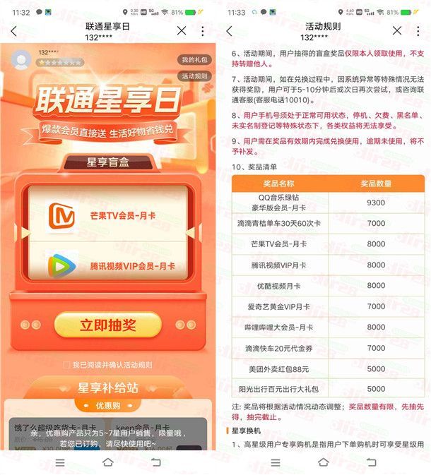 中国联通星享日五星用户抽腾讯视频、爱奇艺、优酷会员月卡