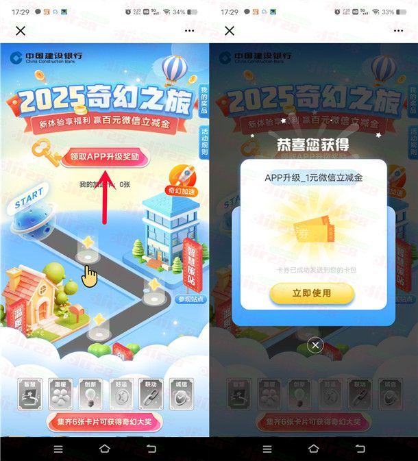 参加建行举办的2025奇幻之旅赢百元微信立减金活动,先将中国建设银行APP更新到最新版本,再打开APP进去活动里,进去可以领到1元升级APP的微信立减金,点“奇幻加速”和使用加速卡集齐6张卡片还可以必中2-100元微信立减金,如果升级了APP还不能参加就卸载掉APP重新安装,就可以参加。