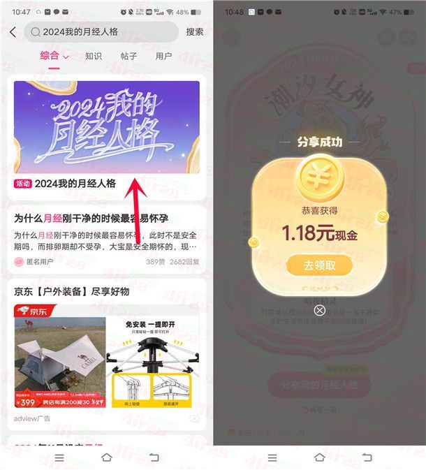 参加美柚举办的2024我的月经人格抽30万现金红包活动,通过下载打开“美柚”APP搜索【2024我的月经人格】点横幅进去,按照提示滑动到最底部分享抽奖,有机会中到随机金额的现金红包,红包数量有30万份,小编测试中到1.18元,可以提现到支付宝不秒到。
