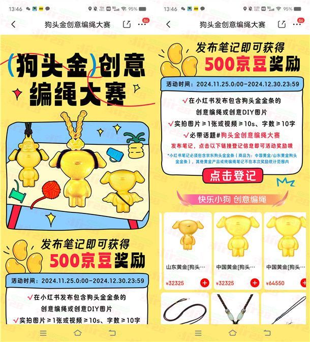 参加京东举办的狗头金创意编绳大赛发笔记领500京豆活动,通过打开京东APP进去活动里,按照提示去小红书发笔记,然后回到京东活动里提交,审核通过后就可以得到500个京豆(价值5元),得到的京东可以在京东购物的时候抵扣使用。