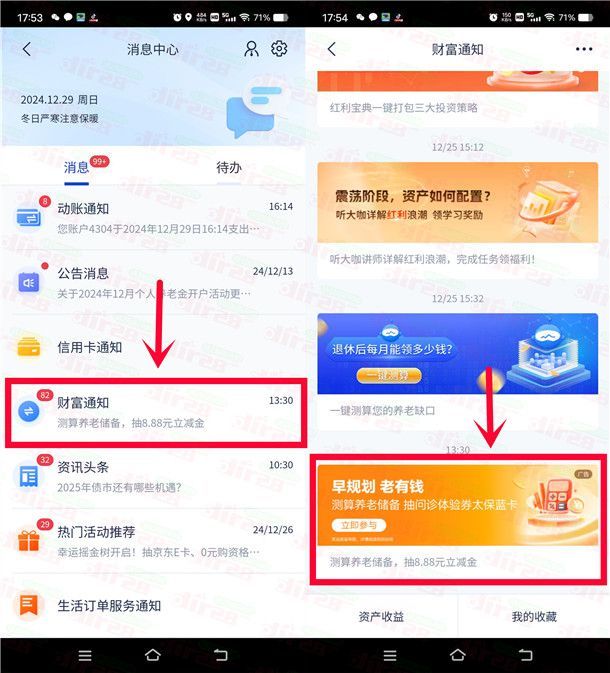参加浦发银行举办的测算养老储备抽最高8.88元支付宝红包活动,注册过浦发银行二类电子卡的都可以去,通过打开“浦发银行”APP,首页点右上角+号,再点【我的消息】进去,再点【财富通知】进去点【早规划老有钱】参加,完成1个简单的小测算再点右侧图标抽奖,有机会中到0.68-8.88元支付宝红包,小编测试中到0.68元,非必中。