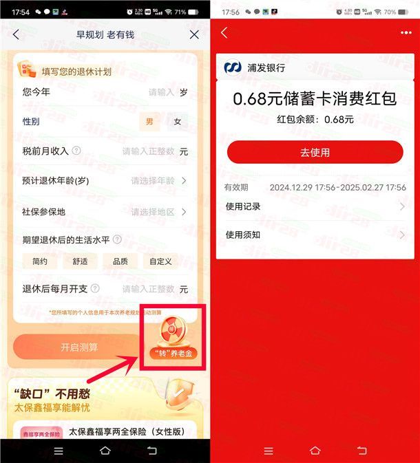 小编提示:打开“浦发银行”APP,首页点右上角+号,再点【我的消息】进去,再点【财富通知】进去点【早规划老有钱】参加,完成1个简单的小测算再点右侧图标抽奖,刚中0.68元,非必中