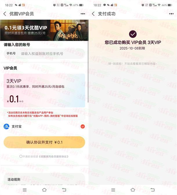 支付宝0.1元开通3天优酷VIP会员秒到 需要优酷会员的去