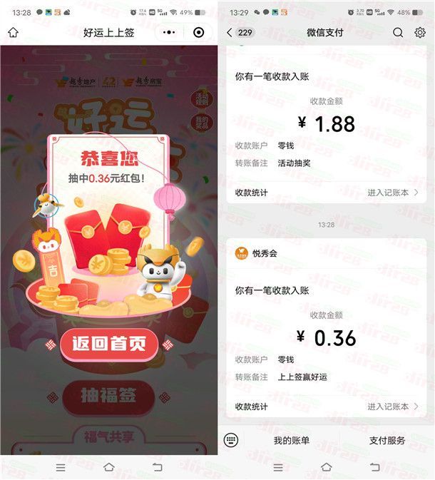 参加越秀房宝举办的好运上上签抽最高88元微信红包活动,通过打开微信进去小程序活动里,在活动里直接点抽福签抽奖,不限次数,如果没中可以反复抽,小编测试中到0.36元红包秒推零钱,号多的可以换号撸,非必中。