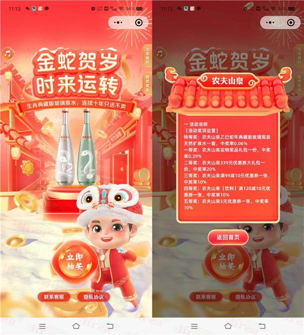 农夫山泉小程序抽蛇年典藏版天然矿泉水1套 每天可抽非必中