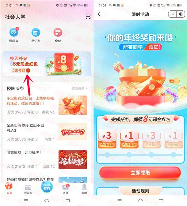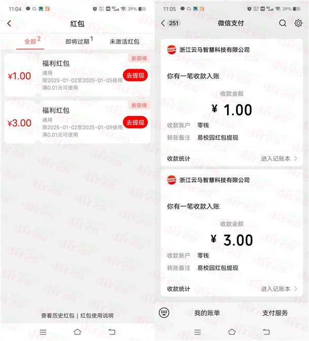 参加易校园举办的限时活动领年终奖活动,之前参加过易校园类似活动的也可以去,通过打开易校园APP进去活动里,第一笔支付0.8元左右可以得到3元微信红包、第二笔支付0.5元可以得到1元微信红包,第2天还可以支付1.2元左右+0.5元左右得到3元+1元微信红包,合计加起来就是支付3元左右领8元微信红包,每天数量限量。