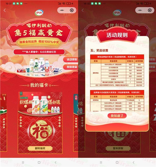 伊利集5福赢黄金活动抽最高66元微信红包、500元京东卡