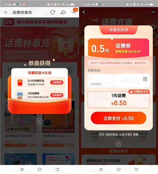 淘宝简单领2个0.5元话费红包 可1充2元电信、联通手机话费