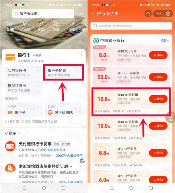 1、先打开支付宝APP搜索【银行卡优惠】进去,下拉页面点【查看更多】展开中国农业银行的全部,看看有没有10.8元绑卡红包,如果有的话继续看下一步操作