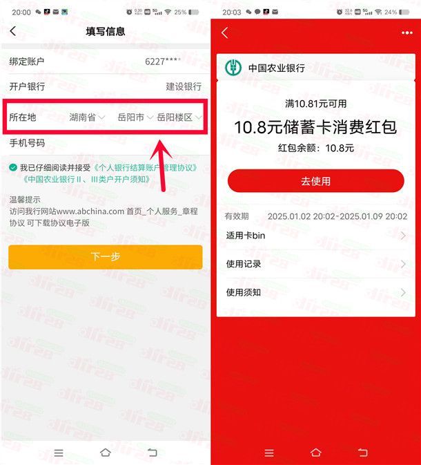 农行这个活动全国所有地区都可以去参加,通过打开中国农业银行APP开通一张湖南省岳阳市的三类电子卡,然后再将这张三类电子卡绑定到支付宝APP,就可以得到10.8元支付宝红包,秒到支付宝卡包里,可以在支付宝APP付款的时候使用,也可以变现。