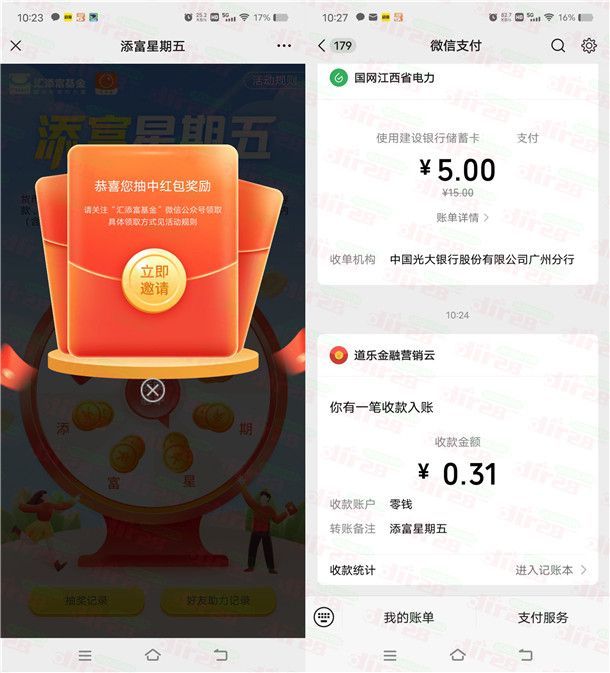 参加汇添富基金举办的添富星期五抽随机红包活动,通过打开微信关注微信公众号“汇添富基金”点菜单栏“活动福利”-“添富星期五”进去抽,有机会中到随机金额的微信红包,小编测试刚中0.31元,中到红包需要手动领取才会推送。