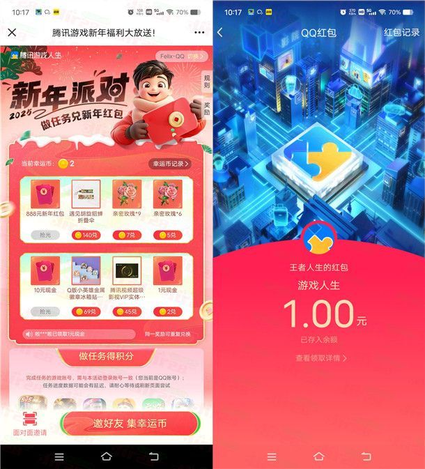参加腾讯游戏人生举办的2025新年派对做任务兑新年红包活动,通过打开微信和手机QQ进去活动里,下拉页面完成指定的任务可以获得幸运币,累积得到的幸运币可以兑换现金红包、实物,用户简单登录2个游戏可以领1元现金红包,没有登录任务就需要邀请好友助力,微信和QQ都可以去,数量限量。