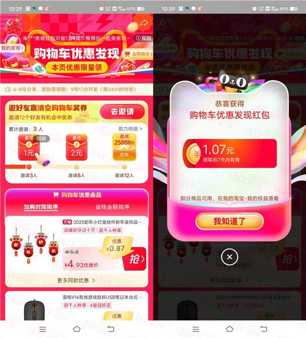 淘宝2025年货节购物车优惠发现抽最高25888元无门槛红包的活动来了,跟以往类似活动的参与方式一样,通过打开淘宝APP进去活动里,分享3个好友、8个好友、12个好友助力可分别领取到最少1元+2元+3元无门槛红包,分享好友或者小号都可以,还有25888元清空购物车大奖。