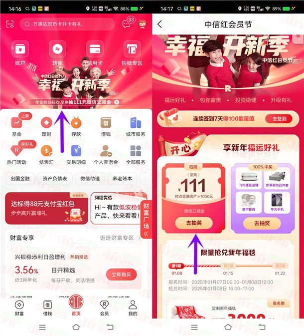 小编提示:打开中信银行APP,首页点顶部【幸福开新季】,每周可以抽奖1次,只要转入1000元到二类电子卡里就可以抽,有机会中到1-111元微信立减金,小编测试刚中1元微信立减金,转入的钱可以随时转出