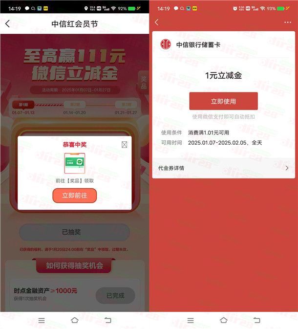 中信银行幸福开新季抽1-111元微信立减金 亲测中1元秒到