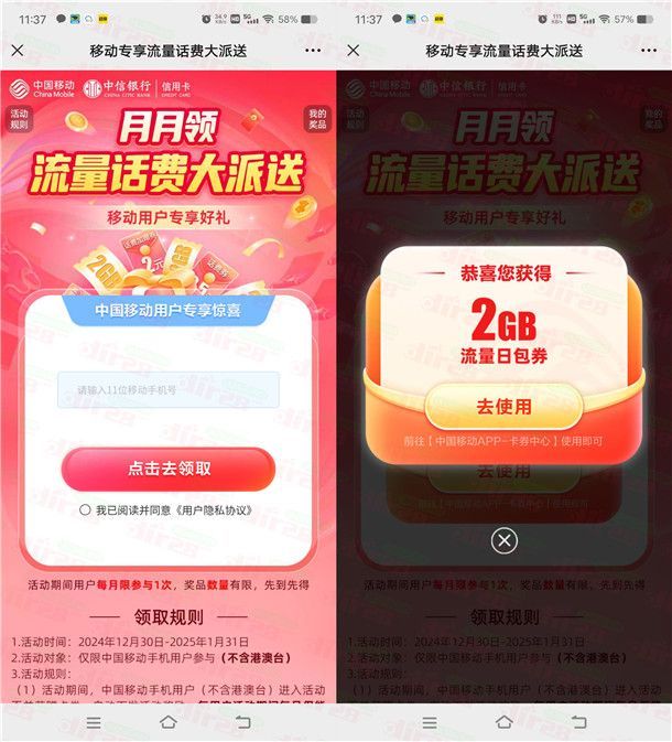 中国移动直接领2G手机流量、0.5元手机话费 亲测中2G流量日包