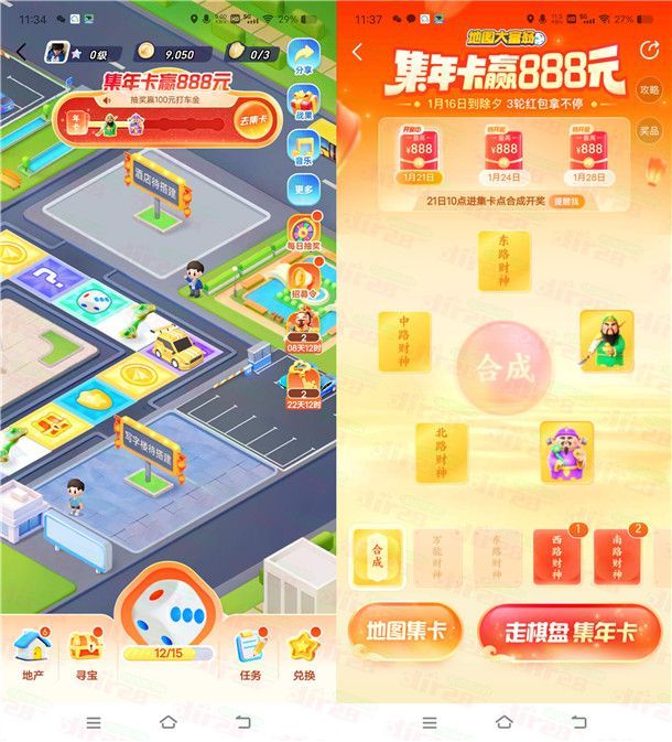 参加高德地图举办的集年卡赢888元现金红包活动,通过打开“高德地图”APP搜索【地图大富翁】进去,每天完成指定的任务和小游戏抽年卡、还可以在兑换中心兑换年卡,集齐5张不同的年卡可以瓜分现金红包,分别在1月211月24日、1月28日瓜分。