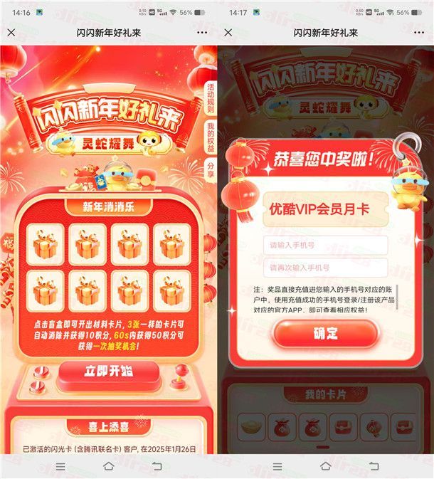 参加邮储银行举办的闪闪新年好礼来活动,有邮储闪光卡的可以去,通过打开微信搜索公众号“邮储联名卡”点菜单栏“爆款专区”-“闪光卡春节活动”进去,点盲盒小游戏达到50分可以抽奖,有机会中到5-2025元支付宝红包、各大视频会员,小编测试刚中1个月优酷会员,非必中。