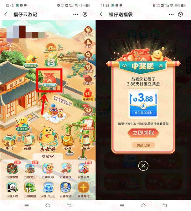 小编提示:打开中国银行APP搜索【福仔云游记】进去,点【福仔送福袋】进去做任务抽,刚中3.88元支付宝红包,非必中