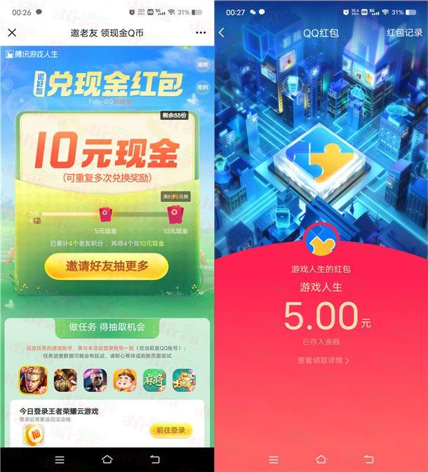 又来一个新的腾讯游戏人生的活动,微信和QQ都可以去参加,通过打开微信和手机QQ进去活动里,邀请好友或者小号助力得老友积分可以兑换5元、10元现金红包,下拉页面还可以邀请好友或者完成登录任务领现金红包,数量限量。
