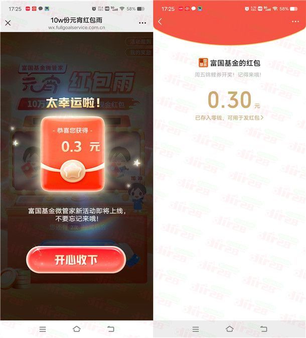 富国基金元宵红包雨活动抽10万个微信红包 亲测中0.3元