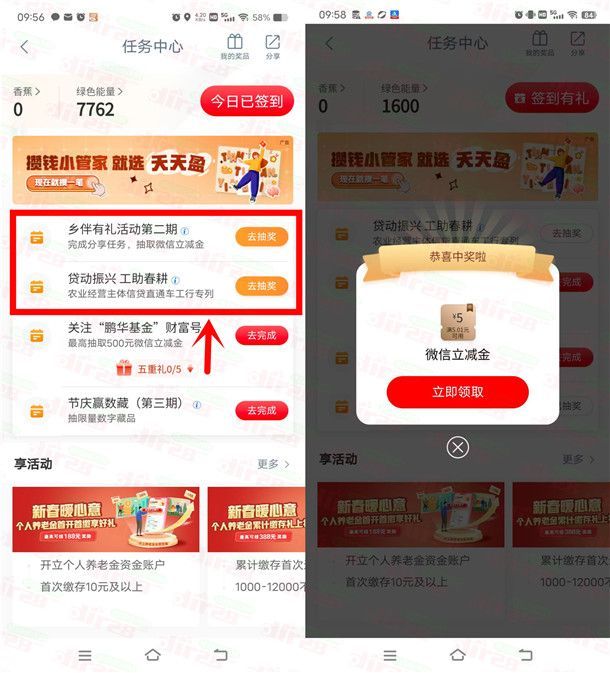 小编提示:打开“中国工商银行”APP搜索【任务中心】进去,找到【相伴有礼活动第二期】和【贷动振兴工助春耕】这2个活动简单浏览一下就可以抽奖2次,刚中5元微信立减金,共20万份,非必中
