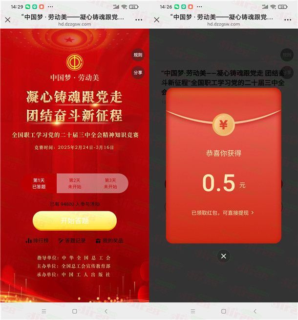 安徽省总工会中国梦答题抽随机微信红包 亲测中0.5元推零钱