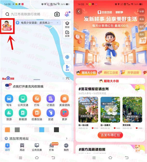 参加百度地图举办的发新鲜事分享美好生活抽最高100元微信红包活动,通过打开最新版本的“百度地图”APP,首页点左上角图标【抽红包】进去,随便拍一张照片后再点击你发布的进去就会弹窗自动抽奖,可以抽多次,每次都有机会中到0.3-100元微信红包,小编测试中到0.5元,可以提现到微信秒推,非必中。