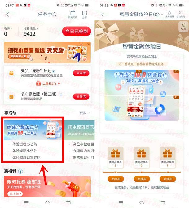 小编提示:打开“中国工商银行”APP搜索【任务中心】进去,下拉页面在享活动那里点【智慧金融体验日】进去,完成3个简单的浏览任务可以抽3次,刚中2元,非必中