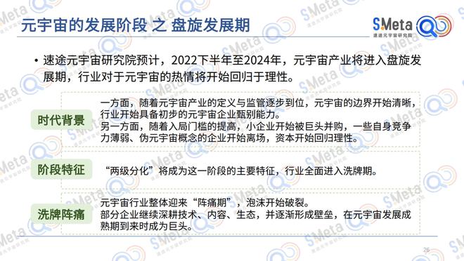 “一方面,随着元界行业的界定和监管逐步到位,元界的边界开始清晰,行业开始具备初步识别元界公司的能力; 《报告》指出,开始被巨头收购,一些竞争力较弱、伪元界概念的企业开始退出市场,资本开始回归理性。